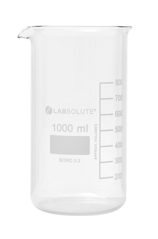 Bechergläser, hohe Form, aus Borosilikatglas 3.3, mit dauerhafter, aufgedruckter Volumenskala und Ausguss, 1000 ml, gemäß DIN 12331 und ISO 3819, VE=10, LABSOLUTE®, 10 Stück