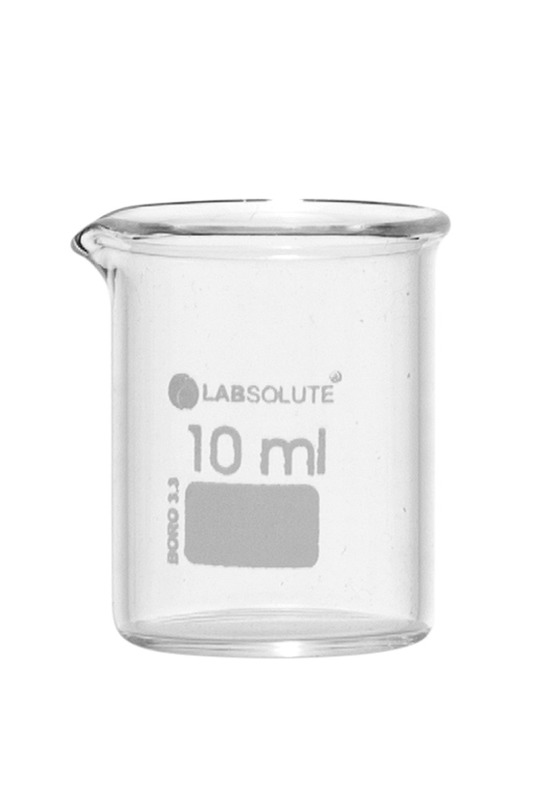 Bechergläser, niedrige Form, aus Borosilikatglas 3.3, mit dauerhafter, aufgedruckter Volumenskala und Ausguss, 10 ml, gemäß DIN 12331 und ISO 3819, VE=10, LABSOLUTE®, 10 Stück