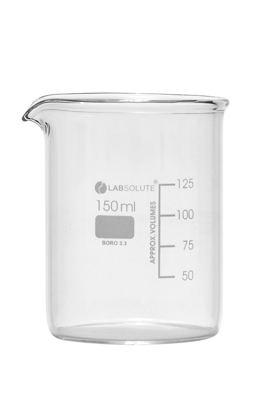 Bechergläser, niedrige Form, aus Borosilikatglas 3.3, mit dauerhafter, aufgedruckter Volumenskala und Ausguss, 150 ml, gemäß DIN 12331 und ISO 3819, VE=10, LABSOLUTE®, 10 Stück