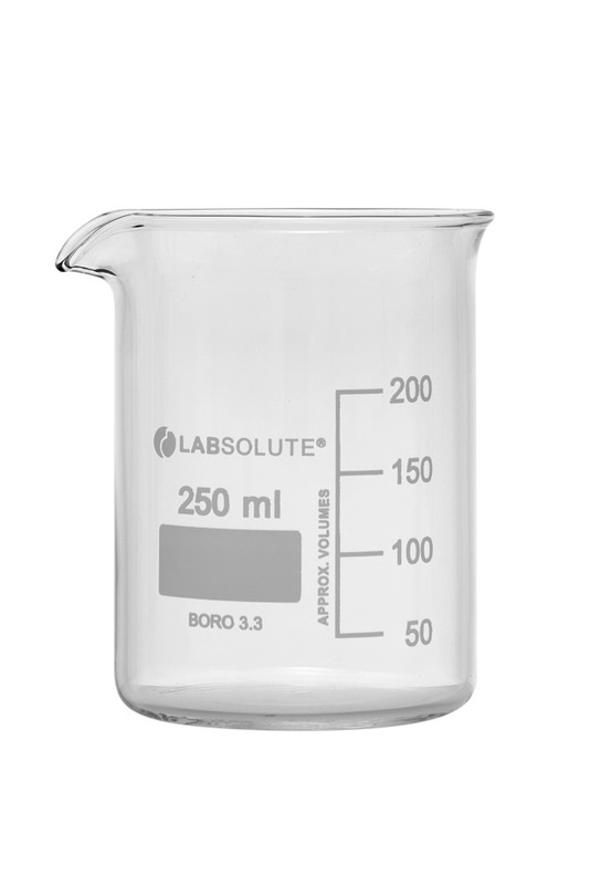 Bechergläser, niedrige Form, aus Borosilikatglas 3.3, mit dauerhafter, aufgedruckter Volumenskala und Ausguss, 250 ml, gemäß DIN 12331 und ISO 3819, VE=10, LABSOLUTE®, 10 Stück