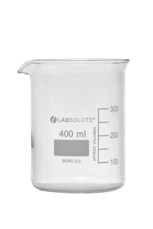 Bechergläser, niedrige Form, aus Borosilikatglas 3.3, mit dauerhafter, aufgedruckter Volumenskala und Ausguss, 400 ml, gemäß DIN 12331 und ISO 3819, VE=10, LABSOLUTE®, 10 Stück