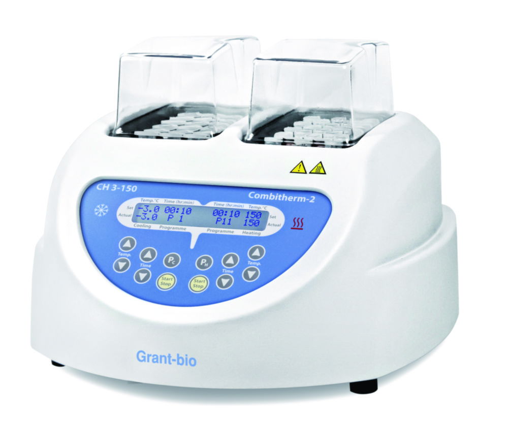 Blockthermostat mit Kühl- und Heizfunktion und mit 2 unabhängigen Modulen für austauschbare Blöcke, kombiniert in einer Einheit. Das Bedienfeld ist zweigeteilt, um die Kühl- und Heizblöcke getrennt zu steuern.
