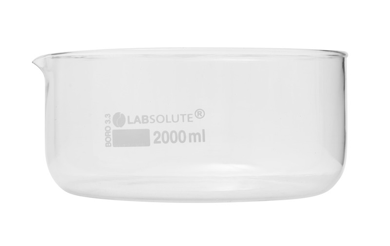 Kristallisierschale, 2000 ml, Ø=190 mm,h=90 mm, aus Borosilikatglas 3.3, klar,zylindrisch, gemäß DIN 12338, mit flachem,Boden und Ausguss, VE=1, LABSOLUTE®, 1 Stück