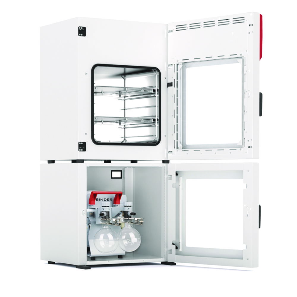 Set consisting of VP1 vacuum pump, pump cabinet (under cabinet) for housing the pump and a connection kit for connecting the pump to the VD series vacuum drying oven. The under cabinet raises the vacuum drying chamber to an ergonomic working height, reduces pump noise and protects the pump from mechanical damage. The pump cabinet contains a switchable socket that can be controlled via the controller of the vacuum drying oven.