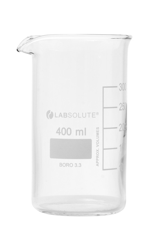 Bechergläser, hohe Form, aus Borosilikatglas 3.3, mit dauerhafter, aufgedruckter Volumenskala und Ausguss, 400 ml, gemäß DIN 12331 und ISO 3819, VE=10, LABSOLUTE®, 10 Stück