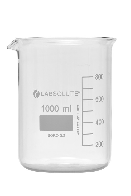 Bechergläser, niedrige Form, aus Borosilikatglas 3.3, mit dauerhafter, aufgedruckter Volumenskala und Ausguss, 1000 ml, gemäß DIN 12331 und ISO 3819, VE=10, LABSOLUTE®, 10 Stück