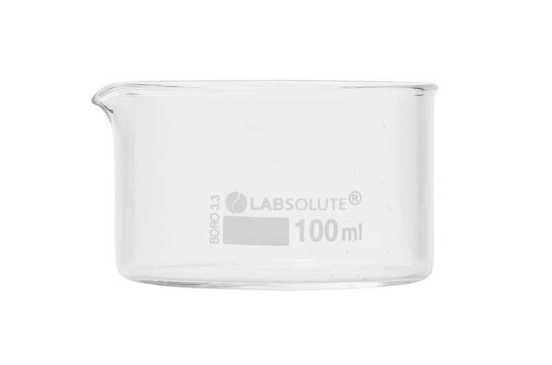 Kristallisierschale, 100 ml, Ø=70 mm, h=40,mm, aus Borosilikatglas 3.3, klar, zylindrisch,gemäß DIN 12338, mit flachem Boden und,Ausguss, VE=1, LABSOLUTE®, 1 Stück