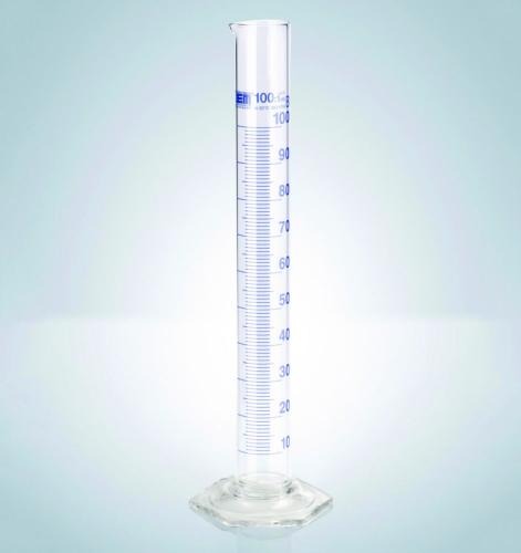 Messzylinder DURAN®, Kl. B, blau graduiert, 5:0,1 ml, H 115 mm, Strichteilung, gemäß DIN EN ISO 4788.
