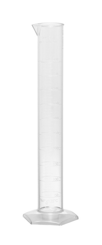 Messzylinder, 500 ml, hohe Form, Klasse A, Graduierung 2,50 ml, Höhe 388 mm, PMP, glasklar, erhabene Skala, justiert auf In (20 °C), gemäß DIN 12681 und ISO 6706, Sechskant-Fuß, mit Auslauf, VE=1, LABSOLUTE®, 1 Stück