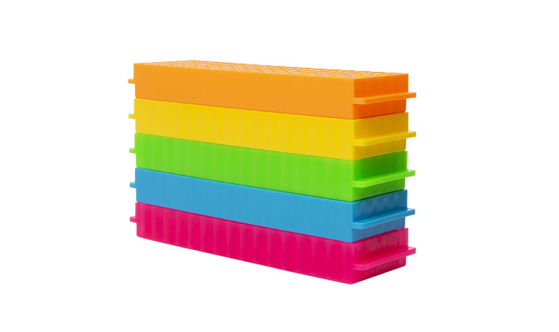 Reaktionsgefäßständer für 1,5 / 2 ml Reaktionsgefäße, 80 Stellplätze, PP, farbig sortiert (blau, gelb, grün, orange, pink), VE=5, LABSOLUTE®, 5 Stück