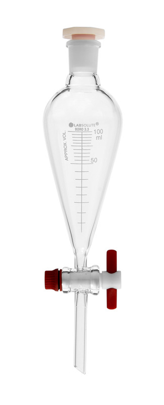 Scheidetrichter, 100 ml, NS 19/26,Borosilikatglas 3.3, nach Squibb, ISO 4800,mit PTFE-Küken, PE-Stopfen und,Graduierung, weiße Beschriftung, VE=1,LABSOLUTE®, 1 Stück